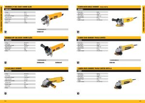 IRONMAN LP SAG 720W 100MM SLIDE IRONMAN MP SAG 850W 100MM SLIDE 1010W ANGLE GRINDER DWE8100S DWE8200S DWE8300S Voltage 220 V Power Input 720 W No-Load / Rated Speed 12000 / min Wheel Diameter 100 mm Spindle Diame M10 Switch Style Silde Weight 1.58 Kg Voltage 220-240 V Power Input 850 W No-Load / Rated Speed 12000 / min Wheel Diameter 100 mm Spindle Diame M10 Switch Style Silde Weight 1.75 Kg Voltage 220-240 V Power Input 1010 W No-Load / Rated Speed 11000 min-1 Wheel Diameter 100 mm Wheel Thickness ( MAX ) 4.0 mm Spindle Diame M10 Spindle Length 18.5 mm Switch Style Silde Weight 1.85 Kg DWE8100T DWE8200PL DWE8200T ALSO AVAILABLE AS : ALSO AVAILABLE AS : 100MM 800W ANGLE GRINDER - TOGGLE SWITCH DWE4001 Power Input 800W Disc Diameter 100 mm Switch Type Toggle No Load Speed 12000 rpm Spindle Thread M10 Weight 1.72 kg Length x Height 270 x 80 mm 100MM 750W GRINDER TOGGLE SWITCH DW810 Power Input 750 W Disc Diameter 100 mm Switch Type Toggle No Load Speed 11000 rmp Spindle Thread M14 Weight 1.67 Kg Length x Height 270 x 80 mm DW810B ALSO AVAILABLE AS : 100MM 850W GRINDER TOGGLE SWITCH WITH LA DW801 Power Input 850 W Disc Diameter 100 mm Switch Type Toggle No Load Speed 11000 rpm Spindle Thread M14 Weight 1.8 Kg Length x Height 270 x 80 mm GRINDERS AND METAL WORKING TOOLS 123 122 GRINDERS AND METAL WORKING TOOLS