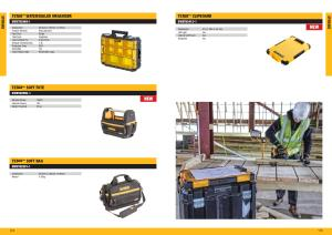 TSTAK ™ SOFT TOTE DWST82990-1 Material Denier 1200D Internal Volume 18L Weight Capacity 30 kg TSTAK ™ WATERSEALED ORGANISER DWST82968-1 Dimensions 440mm x 337mm x 119mm Product Material Polycarbonate Pack Size Single Case Type Organiser Case Suitable For Small Parts Storage Volume ( Litres ) 7.8L Protection Class IP54 Stackable Yes Inlay Product Type Removable Cups TSTAK ™ SOFT BAG DWST82991-1 Dimensions 450mm x 250mm x 300mm Weight 0.92kg TSTAK ™ CLIPBOARD DWST83412-1 Dimensions 41.5 x 28.5 x 3.5 mm LED Light Yes Internal Soft Pouch Yes Stackable Yes NEW NEW 175 174 STORAGE STORAGE