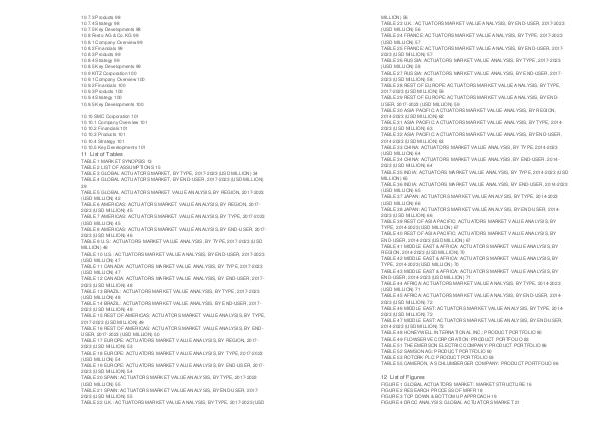 TABLE 1 MARKET SYNOPSIS 13 TABLE 2 LIST OF ASSUMPTIONS 15 TABLE 3 GLOBAL ACTUATORS MARKET, BY TYPE, 2017-2023( USD MILLION) 34 TABLE 4 GLOBAL ACTUATORS MARKET, BY END-USER, 2017-2023( USD MILLION) 39 TABLE 5 GLOBAL ACTUATORS MARKET VALUE ANALYSIS, BY REGION, 2017-2023( USD MILLION) 42 TABLE 6 AMERICAS: ACTUATORS MARKET VALUE ANALYSIS, BY REGION, 2017- 2023( USD MILLION) 45 TABLE 7 AMERICAS: ACTUATORS MARKET VALUE ANALYSIS, BY TYPE, 2017-2023( USD MILLION) 45 TABLE 8 AMERICAS: ACTUATORS MARKET VALUE ANALYSIS, BY END-USER, 2017- 2023( USD MILLION) 46 TABLE 9 U. S.: ACTUATORS MARKET VALUE ANALYSIS, BY TYPE, 2017-2023( USD MILLION) 46 TABLE 10 U. S.: ACTUATORS MARKET VALUE ANALYSIS, BY END-USER, 2017-2023( USD MILLION) 47 TABLE 11 CANADA: ACTUATORS MARKET VALUE ANALYSIS, BY TYPE, 2017-2023( USD MILLION) 47 TABLE 12 CANADA: ACTUATORS MARKET VALUE ANALYSIS, BY END-USER, 2017- 2023( USD MILLION) 48 TABLE 13 BRAZIL: ACTUATORS MARKET VALUE ANALYSIS, BY TYPE, 2017-2023( USD MILLION) 48 TABLE 14 BRAZIL: ACTUATORS MARKET VALUE ANALYSIS, BY END-USER, 2017- 2023( USD MILLION) 49 TABLE 15 REST OF AMERICAS: ACTUATORS MARKET VALUE ANALYSIS, BY TYPE, 2017-2023( USD MILLION) 49 TABLE 16 REST OF AMERICAS: ACTUATORS MARKET VALUE ANALYSIS, BY END- USER, 2017-2023( USD MILLION) 50 TABLE 17 EUROPE: ACTUATORS MARKET VALUE ANALYSIS, BY REGION, 2017- 2023( USD MILLION) 53 TABLE 18 EUROPE: ACTUATORS MARKET VALUE ANALYSIS, BY TYPE, 2017-2023( USD MILLION) 54 TABLE 19 EUROPE: ACTUATORS MARKET VALUE ANALYSIS, BY END-USER, 2017- 2023( USD MILLION) 54 TABLE 20 SPAIN: ACTUATORS MARKET VALUE ANALYSIS, BY TYPE, 2017-2023( USD MILLION) 55 TABLE 21 SPAIN: ACTUATORS MARKET VALUE ANALYSIS, BY END-USER, 2017- 2023( USD MILLION) 55 TABLE 22 U. K.: ACTUATORS MARKET VALUE ANALYSIS, BY TYPE, 2017-2023( USD