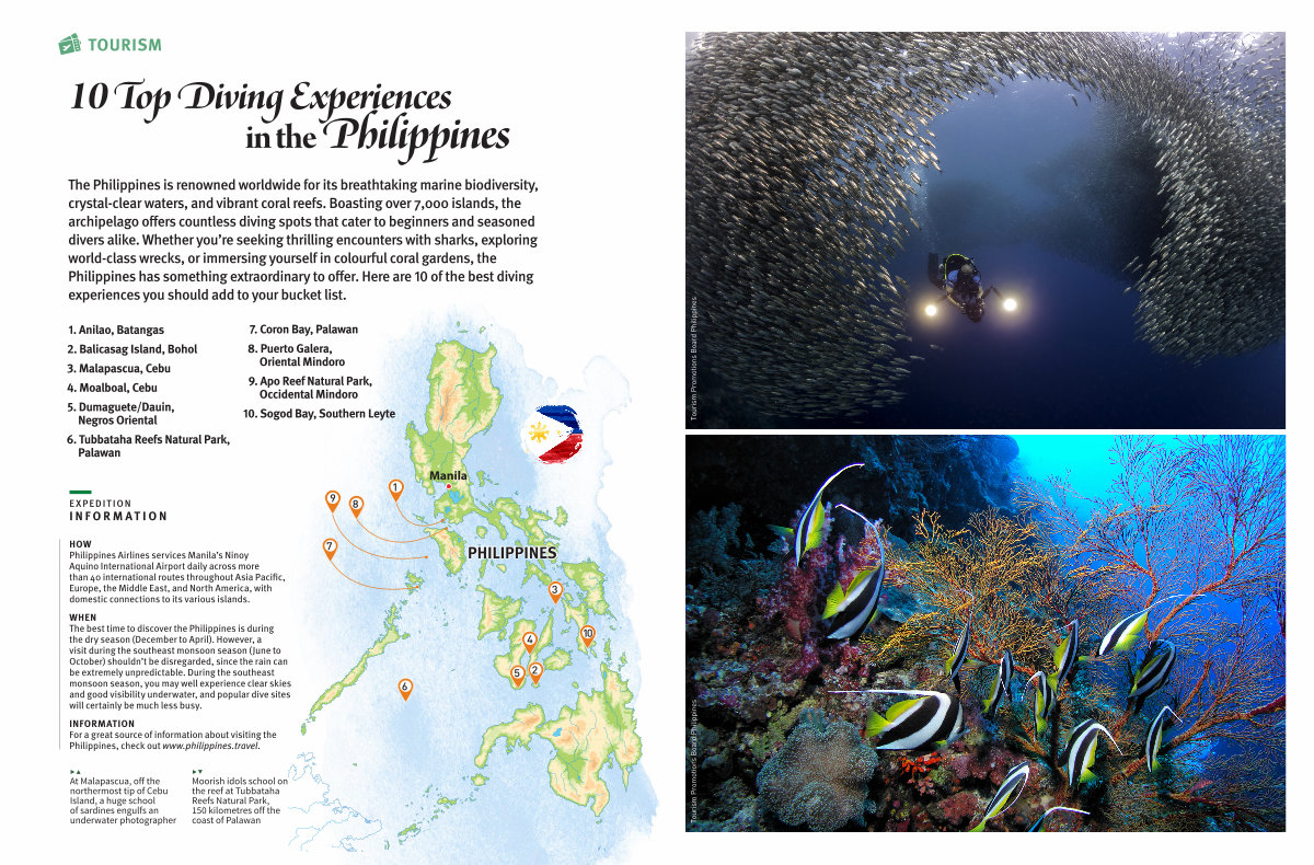 The Philippines is renowned worldwide for its breathtaking marine biodiversity, crystal-clear waters, and vibrant coral reefs. Boasting over 7,000 islands, the archipelago offers countless diving spots that cater to beginners and seasoned divers alike. Whether you’ re seeking thrilling encounters with sharks, exploring world-class wrecks, or immersing yourself in colourful coral gardens, the Philippines has something extraordinary to offer. Here are 10 of the best diving experiences you should add to your bucket list.
