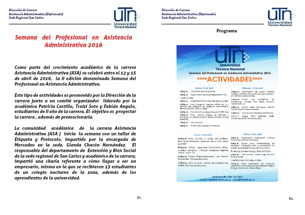 Como parte del crecimiento académico de la carrera Asistencia Administrativa (ASA) se celebró entre el 12 y 15 de abril de 2016, la II edición denominada Semana del Profesional en Asistencia Administrativa.