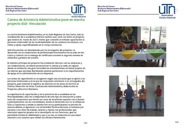 ASA-Vinculación, así denominado por los encargados del proyecto; se desarrolló con la colaboración de profesionales-funcionarios de la sede de San Carlos y culminó con la entrega de certificados durante la segunda semana de setiembre y primera de octubre.