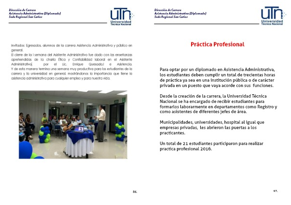 Desde la creación de la carrera, la Universidad Técnica Nacional se ha encargado de recibir estudiantes para formarlos laborarmente en departamentos como Registro y como asistentes de diferentes jefes de área.