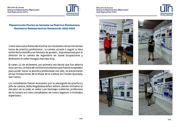 Como una nueva forma de mostrar los resultados de las trecientas horas de práctica profesional , la carrera accede a seguir la idea estilo feria cientifica en formato de posters, imprementada por el director de la carrera de Ingenieria en Salud Ocupacional y Ambiente el señor Douglas Barraza Ruiz.