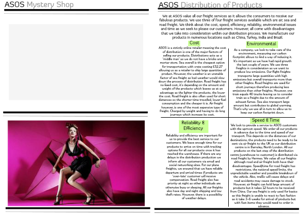 We look to provide a service to ASOS customers with the upmost speed. We order all our products in advance due to the time and speed of our transport. This depends on the distances of our destinations, the products need to be ready to be sent via air freight to the UK as our distribution centre is in Barnsley, North London. All our products on the last step of the distribution centre (warehouse to customer) is distributed via road freight by Hermes. We value all our freights although road and air freight both have their disadvantages. Speed/time for road freight has restrictions, the national speed limits, the unpredictable weather and possible breakdown of the vehicle. Also, traffic will cause delays and road accidents may cause damage to stock. However, air freight can hold large amount of products but it takes 12 hours to be received from China. Our sea freight is only used for basics as this freight is unable to react to fast fashion as it take 3-6 weeks for arrival of products but with fast items they would need to order in advance.