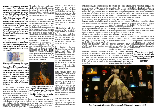 What the exhibition does do, is steer us quietly away from the unsettling drama, which McQueen so often gave us with his shows. The undertone of death and violence, which so often ran through the collections when shown, is missing from this exhibition. Instead we are given a truly beautiful array of masterpieces, with with to remember the genius of Alexander McQueen.