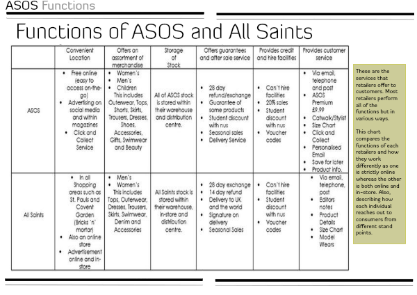 This chart compares the functions of each retailers and how they work differently as one is strictly online whereas the other is both online and in-store. Also, describing how each individual reaches out to consumers from different stand points.