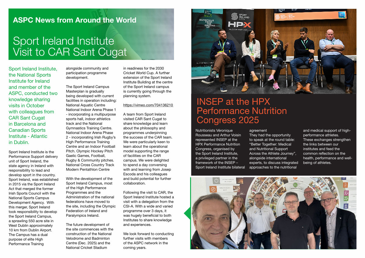 Sport Ireland Institute, the National Sports Institute for Ireland and member of the ASPC, conducted two knowledge sharing visits in October with colleagues from CAR Sant Cugat in Barcelona and Canadian Sports Institute- Atlantic in Dublin.