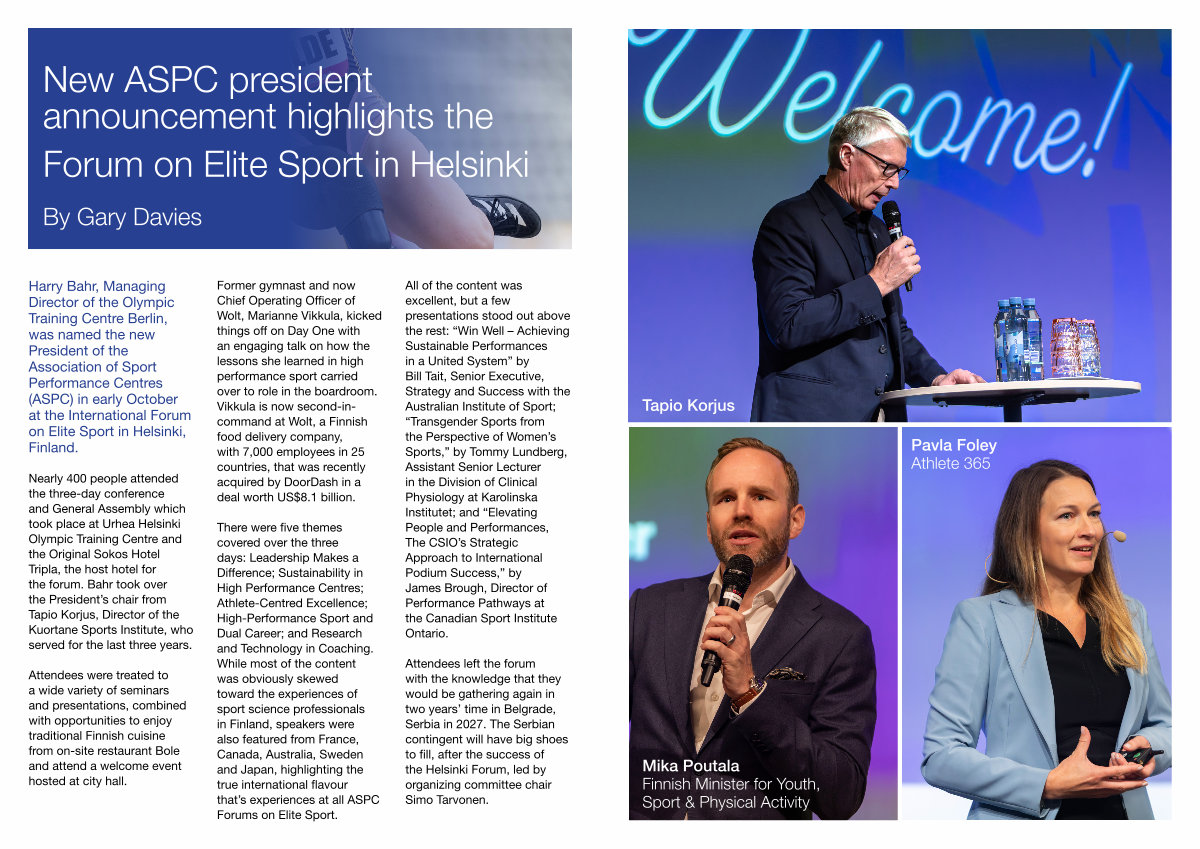 Harry Bahr, Managing Director of the Olympic Training Centre Berlin, was named the new President of the Association of Sport Performance Centres( ASPC) in early October at the International Forum on Elite Sport in Helsinki, Finland.