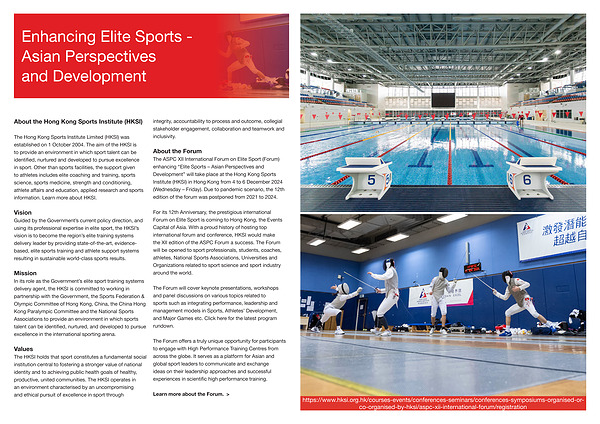 For its 12th Anniversary , the prestigious international Forum on Elite Sport is coming to Hong Kong , the Events Capital of Asia . With a proud history of hosting top international forum and conference , HKSI would make the XII edition of the ASPC Forum a success . The Forum will be opened to sport professionals , students , coaches , athletes , National Sports Associations , Universities and Organizations related to sport science and sport industry around the world .