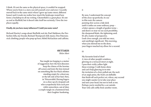 I think. It’s not the same as the physical space, it couldn’t be mapped. Where you’re from is a story you tell yourself, over and over. I recently moved back to the same street where I grew up (same street, different house) and it made me realise how much the landscape round here forms a backdrop to all my writing. Chesterfield is a great place. It’s not as cool as Sheffield, but it doesn’t take itself too seriously. I love the two places equ ally. Finally, do you have many influences? Could you name some? Richard Hawley’s songs about Sheffield; real ale; Paul Muldoon; the Derbyshire fells; my friends; Richard Thompson’s folk music; Don Paterson; rock climbing; people who prop up bars; Mebd McGuckian and caffeine.
