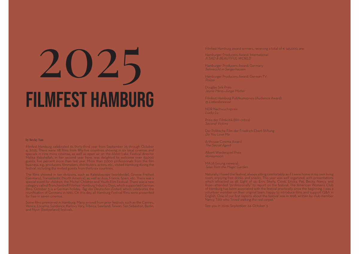 Filmfest Hamburg celebrated its thirty-third year from September 25 through October 4, 2025. There were 118 films from fifty-five countries showing in six local cinemas and specials in nine more cinemas, as well as open air on the Alster Lake. Festival director Malika Rabahallah, in her second year here, was delighted to welcome over 62,000 guests, five percent more than last year. More than 2,000 professionals from the film business, e. g., producers, filmmakers, distributors, actors, etc., visited Hamburg during the festival, including 814 invited guests from thirty-six countries.