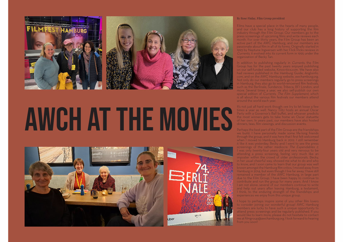 Films have a special place in the hearts of many people, and our club has a long history of supporting the film industry through the Film Group. Our members go to the press screenings of upcoming films and write reviews each month. For over thirty years, the Film Group has been an active part of the AWC Hamburg, and our members are passionate about film in all of its forms. Originally started in 1993 by Neptune Ingwersen with her Flick Picks reviews in