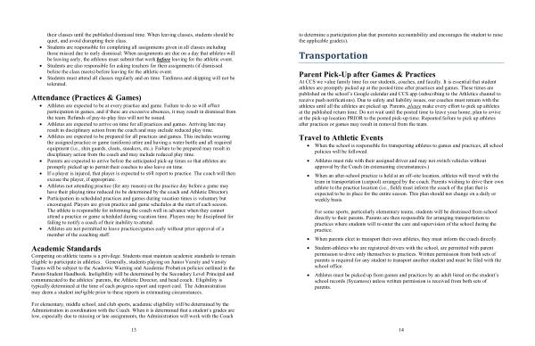 At CCS we value family time for our students , coaches , and faculty . It is essential that student athletes are promptly picked up at the posted time after practices and games . These times are published on the school ’ s Google calendar and CCS app ( subscribing to the Athletics channel to receive push notifications ). Due to safety and liability issues , our coaches must remain with the athletes until all the athletes are picked up . Parents , please make every effort to pick up athletes at the published return time . Do not wait until the posted time to leave your home ; plan to arrive at the pick-up location PRIOR to the posted pick-up time . Repeated failure to pick up athletes after practices or games may result in removal from the team .