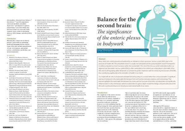 Abstract Many clients who seek bodywork are burdened by an imbalance in their autonomic nervous system ( ANS ), due to the pressures of modern life . The sympathetic branch is usually over-stimulated and the parasympathetic branch hampered in its ability to regulate too much excitation within the visceral realm . The role of the nervous system embedded within our digestive tract , the enteric nervous system ( ENS ), is often overlooked in this context , yet is a key player in the health of the ANS and its self-regulating ability . Bodywork can provide the perfect treatment realm for enhancing the function of the ENS , thus contributing significantly to the restoration of health in our clients .