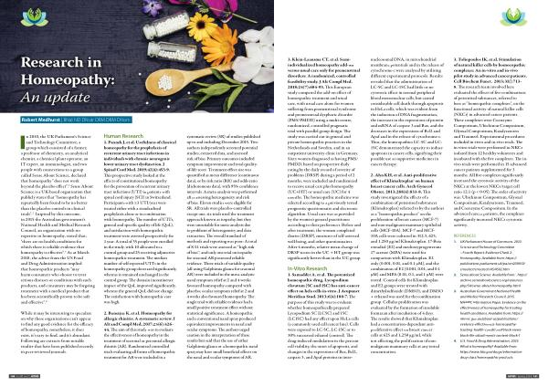 1 . Pannek J , et al . Usefulness of classical homeopathy for the prophylaxis of recurrent urinary tract infections in individuals with chronic neurogenic lower urinary tract dysfunction . J Spinal Cord Med . 2019 ; 42 ( 4 ): 453-9 . This prospective study looked at the effects of constitutional homeopathy for the prevention of recurrent urinary tract infections ( UTI ) in patients with spinal cord injury ( SCI ) in Switzerland . Participants with ≥3 UTI / year were treated either with a standardised prophylaxis alone or in combination with homeopathy . The number of UTI ’ s , general and specific quality of life ( QoL ), and satisfaction with homeopathic treatment were assessed prospectively for 1 year . A total of 35 people were enrolled in the study , with 10 allocated to a control group and 25 receiving adjunctive homeopathic treatment . The median number of self-reported UTI ’ s in the homeopathy group decreased significantly , whereas it remained unchanged in the control group . The domain incontinence impact of the QoL improved significantly , whereas the general QoL did not change . The satisfaction with homeopathic care was high .