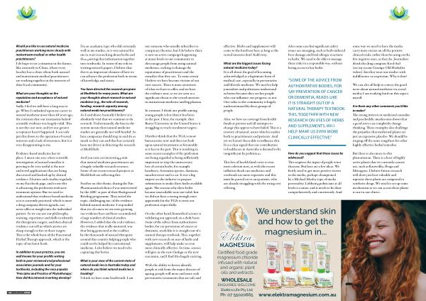 What is your view of the current state of natural medicine in Australia today and where do you think natural medicine is heading ? I think we have some headwinds . I am not someone who usually subscribes to conspiracy theories , but I do believe there is now an active campaign happening at many levels in our community to discourage people from using natural medicines , seeking to damage the reputations of practitioners and the remedies that they use . To some extent I believe we have become victims of our own success . There is more awareness of what we have to offer , and we have the evidence now , so we are seen as a significant threat to the vested interests in mainstream medicine and big pharma .