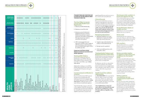 Please note that this table is only a guide to show what funds cover ATMS accredited modalities . If the modality that you are accredited for is not listed , this means that no health fund covers the modality . The only exceptions are Chiropractic and Osteopathy . ATMS accreditation in a modality does not guarantee provider status as all funds have their individual set of strict eligibility requirements . Please see our website www . atms . com . au or contact our office for current requirements . Rebates do not usually cover medicines , only face to face consultations . For further rebate terms and conditions , patients should contact their health fund . Policies may change without prior notice .