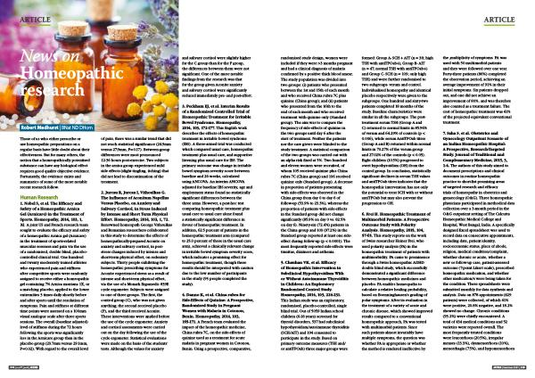 4 . Danno K , et al . China rubra for Side-Effects of Quinine : A Prospective , Randomised Study in Pregnant Women with Malaria in Cotonou , Benin . Homeopathy , 2014 , 103 , 165-171 . A French team evaluated the impact of the homeopathic medicine , China rubra 7C , on the side-effects of quinine used as a treatment for acute malaria in pregnant women in Cotonou , Benin . Using a prospective , comparative ,
