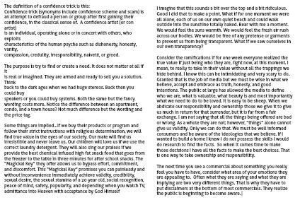 The next time you see a commercial about something you really feel you have to have, consider what area of your emotions they are appealing to. Often what they are saying and what they are implying are two very different things. That is why they have to put disclaimers at the bottom of most commercials. They realize the public is beginning to become aware.