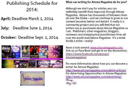 Although we don’t pay for articles you can definitely benefit from exposure through Attune Magazine. Attune has thousands of followers from all over the Globe – and we continue to grow as our content becomes better and better! It really is a community project and you will find that our writers are as passionate about Attune Magazine as I am. Publishers, other magazines, bloggers, reviewers and metaphysical practitioners from all over the world read Attune Magazine. It’s a niche inside a niche – really!