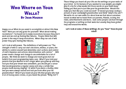These things you heard all your life are the writings on your walls of your mind. So for instance if you wanted to lose weight, you might give it a try for a few weeks but those words on your walls keep telling you that you’re just like your fat grandmother. Would this make you feel like you could succeed? Or would you keep seeing a picture of your overweight grandmother and think “what’s the use”? We write on our own walls too about how we feel about ourselves based on what we’ve heard from our parents, friends, society, the news, advertisements and more. Sure some people can bust through the programs or writing on their walls but usually they have gotten help and erased the words.