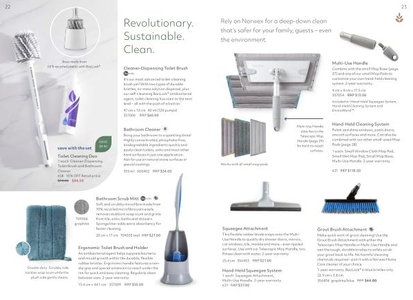 Grout Brush Attachment Make quick work of grout cleaning ! Use the Grout Brush Attachment with either the Telescopic Mop Handle or Multi-Use Handle and wet the tough , durable bristles to safely scrub your grout back to life . No harmful cleaning chemicals required – pair it with a Norwex Home Care cleaner of your choice . 1-year warranty . BacLock ® in blue bristles only . 22.9 cm x 3.8 cm 356404 graphite / blue RRP $ 44.00