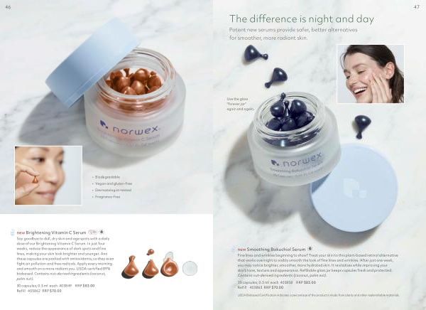 • Fragrance-free new Brightening Vitamin C Serum Say goodbye to dull , dry skin and age spots with a daily dose of our Brightening Vitamin C Serum . In just four weeks , reduce the appearance of dark spots and fine lines , making your skin look brighter and younger . And these capsules are packed with antioxidants , so they even fight air pollution and free radicals . Apply every morning and smooth on a more radiant you . USDA certified 89 % biobased . Contains nut-derived ingredients ( coconut , palm nut ).