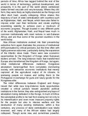 periods of time, Africa has lagged behind the rest of the world in terms of technology, political development, and prosperity. It is the part of the world where centralized states formed very late and very tenuously. Where they did form, they were likely as highly absolutist as the Kongo and often short lived, usually collapsing. Africa shares this trajectory of lack of state centralization with countries such as Afghanistan, Haiti, and Nepal, which have also failed to impose order over their territories and create anything resembling stability to achieve even a modicum of economic progress. Though located in very different parts of the world, Afghanistan, Haiti, and Nepal have much in common institutionally with most nations in sub-Saharan Africa, and are thus some of the poorest countries in the world today.