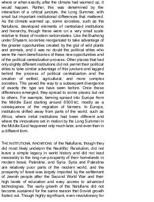 THE INSTITUTIONAL INNOVATIONS of the Natufians, though they did most likely underpin the Neolithic Revolution, did not leave a simple legacy in world history and did not lead inexorably to the long-run prosperity of their homelands in modern Israel, Palestine, and Syria. Syria and Palestine are relatively poor parts of the modern world, and the prosperity of Israel was largely imported by the settlement of Jewish people after the Second World War and their high levels of education and easy access to advanced technologies. The early growth of the Natufians did not become sustained for the same reason that Soviet growth fizzled out. Though highly significant, even revolutionary for