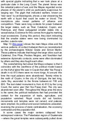 The overwhelming fact about the Maya collapse is that it coincides with the overthrow of the political model based on the k’ uhul ajaw. We saw in Copán that after Yax Pasaj’ s death in AD 810 there were no more kings. At around this time the royal palaces were abandoned. Twenty miles to the north of Copán, in the city of Quiriguá, the last king, Jade Sky, ascended to the throne between AD 795 and 800. The last dated monument is from AD 810 by the Long Count, the same year that Yax Pasaj died. The city was abandoned soon after. Throughout the Maya area the story is the same; the political institutions that had provided the context for the expansion of trade, agriculture, and population vanished. Royal courts did not function, monuments and temples were not carved, and palaces were emptied. As political and social institutions unraveled, reversing the process of state centralization, the economy contracted and the population fell.