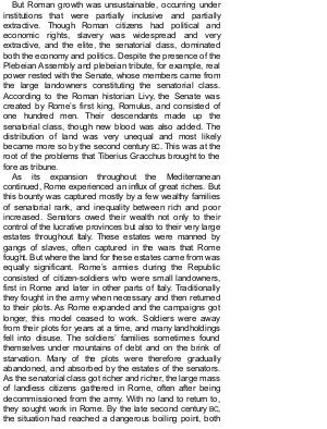 But Roman growth was unsustainable, occurring under institutions that were partially inclusive and partially extractive. Though Roman citizens had political and economic rights, slavery was widespread and very extractive, and the elite, the senatorial class, dominated both the economy and politics. Despite the presence of the Plebeian Assembly and plebeian tribute, for example, real power rested with the Senate, whose members came from the large landowners constituting the senatorial class. According to the Roman historian Livy, the Senate was created by Rome’ s first king, Romulus, and consisted of one hundred men. Their descendants made up the senatorial class, though new blood was also added. The distribution of land was very unequal and most likely became more so by the second century BC. This was at the root of the problems that Tiberius Gracchus brought to the fore as tribune.