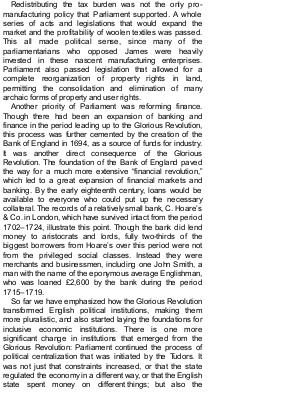 Another priority of Parliament was reforming finance. Though there had been an expansion of banking and finance in the period leading up to the Glorious Revolution, this process was further cemented by the creation of the Bank of England in 1694, as a source of funds for industry. It was another direct consequence of the Glorious Revolution. The foundation of the Bank of England paved the way for a much more extensive“ financial revolution,” which led to a great expansion of financial markets and banking. By the early eighteenth century, loans would be available to everyone who could put up the necessary collateral. The records of a relatively small bank, C. Hoare’ s & Co. in London, which have survived intact from the period 1702 – 1724, illustrate this point. Though the bank did lend money to aristocrats and lords, fully two-thirds of the biggest borrowers from Hoare’ s over this period were not from the privileged social classes. Instead they were merchants and businessmen, including one John Smith, a man with the name of the eponymous average Englishman, who was loaned £ 2,600 by the bank during the period 1715 – 1719.