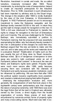 Revolution. Investment in canals and roads, the so-called turnpikes, massively increased after 1688. These investments, by reducing the costs of transportation, helped to create an important prerequisite for the Industrial Revolution. Prior to 1688, investment in such infrastructure had been impeded by arbitrary acts by the Stuart kings. The change in the situation after 1688 is vividly illustrated by the case of the river Salwerpe, in Worcestershire, England. In 1662 Parliament passed an act to encourage investment to make the Salwerpe navigable, and the Baldwyn family invested £ 6,000 to this end. In return they got the right to charge people for navigation on the river. In 1693 a bill was introduced to Parliament to transfer the rights to charge for navigation to the Earl of Shrewsbury and Lord Coventry. This act was challenged by Sir Timothy Baldwyn, who immediately submitted a petition to Parliament claiming that the proposed bill was essentially expropriating his father, who had already heavily invested in the river in anticipation of the charges he could then levy. Baldwyn argued that“ the new act tends to make void the said act, and to take away all the works and materials done in pursuance thereof.” Reallocation of rights such as this was exactly the sort of thing done by Stuart monarchs. Baldwyn noted,“[ I ] t is of dangerous consequence to take away any person’ s right, purchased under an act of Parliament, without their consent.” In the event, the new act failed, and Baldwyn’ s rights were upheld. Property rights were much more secure after 1688, partly because securing them was consistent with the interests of Parliament and partly because pluralistic institutions could be influenced by petitioning. We see here that after 1688 the political system became significantly more pluralistic and created a relatively level playing field within England.