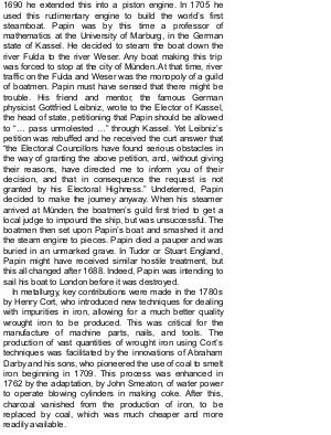 1690 he extended this into a piston engine. In 1705 he used this rudimentary engine to build the world’ s first steamboat. Papin was by this time a professor of mathematics at the University of Marburg, in the German state of Kassel. He decided to steam the boat down the river Fulda to the river Weser. Any boat making this trip was forced to stop at the city of Münden. At that time, river traffic on the Fulda and Weser was the monopoly of a guild of boatmen. Papin must have sensed that there might be trouble. His friend and mentor, the famous German physicist Gottfried Leibniz, wrote to the Elector of Kassel, the head of state, petitioning that Papin should be allowed to“… pass unmolested …” through Kassel. Yet Leibniz’ s petition was rebuffed and he received the curt answer that“ the Electoral Councillors have found serious obstacles in the way of granting the above petition, and, without giving their reasons, have directed me to inform you of their decision, and that in consequence the request is not granted by his Electoral Highness.” Undeterred, Papin decided to make the journey anyway. When his steamer arrived at Münden, the boatmen’ s guild first tried to get a local judge to impound the ship, but was unsuccessful. The boatmen then set upon Papin’ s boat and smashed it and the steam engine to pieces. Papin died a pauper and was buried in an unmarked grave. In Tudor or Stuart England, Papin might have received similar hostile treatment, but this all changed after 1688. Indeed, Papin was intending to sail his boat to London before it was destroyed.