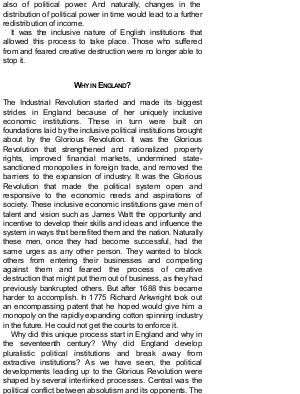 The Industrial Revolution started and made its biggest strides in England because of her uniquely inclusive economic institutions. These in turn were built on foundations laid by the inclusive political institutions brought about by the Glorious Revolution. It was the Glorious Revolution that strengthened and rationalized property rights, improved financial markets, undermined statesanctioned monopolies in foreign trade, and removed the barriers to the expansion of industry. It was the Glorious Revolution that made the political system open and responsive to the economic needs and aspirations of society. These inclusive economic institutions gave men of talent and vision such as James Watt the opportunity and incentive to develop their skills and ideas and influence the system in ways that benefited them and the nation. Naturally these men, once they had become successful, had the same urges as any other person. They wanted to block others from entering their businesses and competing against them and feared the process of creative destruction that might put them out of business, as they had previously bankrupted others. But after 1688 this became harder to accomplish. In 1775 Richard Arkwright took out an encompassing patent that he hoped would give him a monopoly on the rapidly expanding cotton spinning industry in the future. He could not get the courts to enforce it.