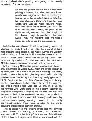 This opposition to the printing press had the obvious consequences for literacy, education, and economic success. In 1800 probably only 2 to 3 percent of the citizens of the Ottoman Empire were literate, compared with 60