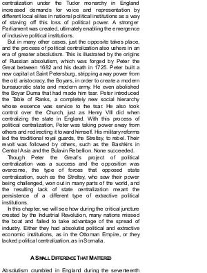 Though Peter the Great’ s project of political centralization was a success and the opposition was overcome, the type of forces that opposed state centralization, such as the Streltsy, who saw their power being challenged, won out in many parts of the world, and the resulting lack of state centralization meant the persistence of a different type of extractive political institutions.