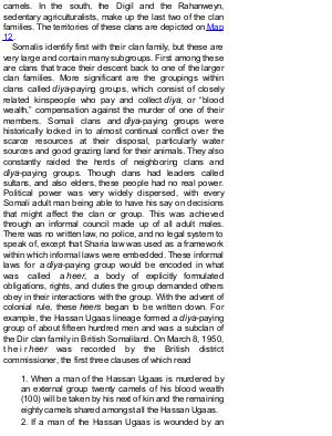 Somalis identify first with their clan family, but these are very large and contain many subgroups. First among these are clans that trace their descent back to one of the larger clan families. More significant are the groupings within clans called diya-paying groups, which consist of closely related kinspeople who pay and collect diya, or“ blood wealth,” compensation against the murder of one of their members. Somali clans and diya-paying groups were historically locked in to almost continual conflict over the scarce resources at their disposal, particularly water sources and good grazing land for their animals. They also constantly raided the herds of neighboring clans and diya-paying groups. Though clans had leaders called sultans, and also elders, these people had no real power. Political power was very widely dispersed, with every Somali adult man being able to have his say on decisions that might affect the clan or group. This was achieved through an informal council made up of all adult males. There was no written law, no police, and no legal system to speak of, except that Sharia law was used as a framework within which informal laws were embedded. These informal laws for a diya-paying group would be encoded in what was called a heer, a body of explicitly formulated obligations, rights, and duties the group demanded others obey in their interactions with the group. With the advent of colonial rule, these heers began to be written down. For example, the Hassan Ugaas lineage formed a diya-paying group of about fifteen hundred men and was a subclan of the Dir clan family in British Somaliland. On March 8, 1950, t h e i r heer was recorded by the British district commissioner, the first three clauses of which read