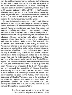But even in these circumstances, couldn’ t black Africans have made their way in the European, modern economy, started a business, or have become educated and begun a career? The government made sure these things could not happen. No African was allowed to own property or start a business in the European part of the economy— the 87 percent of the land. The Apartheid regime also realized that educated Africans competed with whites rather than supplying cheap labor to the mines and to white-owned agriculture. As early as 1904 a system of job reservation for Europeans was introduced in the mining economy. No African was allowed to be an amalgamator, an assayer, a banksman, a blacksmith, a boiler maker, a brass finisher, a brassmolder, a bricklayer … and the list went on and on, all the way to woodworking machinist. At a stroke, Africans were banned from occupying any skilled job in the mining sector. This was the first incarnation of the famous“ colour bar,” one of the several racist inventions of South Africa’ s regime. The colour bar was extended to the entire economy in 1926, and lasted until the 1980s. It is not surprising that black Africans were uneducated; the South African state not only removed the possibility of Africans benefiting economically from an education but also refused to invest in black schools and discouraged black education. This policy reached its peak in the 1950s, when, under the leadership of Hendrik Verwoerd, one of the architects of the Apartheid regime that would last until 1994, the government passed the Bantu Education Act. The philosophy behind this act was bluntly spelled out by Verwoerd himself in a speech in 1954: