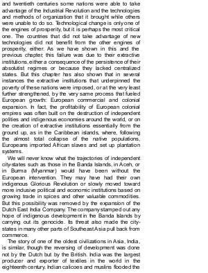 We will never know what the trajectories of independent city-states such as those in the Banda Islands, in Aceh, or in Burma( Myanmar) would have been without the European intervention. They may have had their own indigenous Glorious Revolution or slowly moved toward more inclusive political and economic institutions based on growing trade in spices and other valuable commodities. But this possibility was removed by the expansion of the Dutch East India Company. The company stamped out any hope of indigenous development in the Banda Islands by carrying out its genocide. Its threat also made the citystates in many other parts of Southeast Asia pull back from commerce.