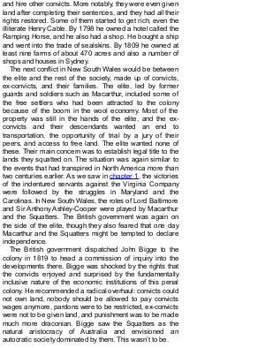 The next conflict in New South Wales would be between the elite and the rest of the society, made up of convicts, ex-convicts, and their families. The elite, led by former guards and soldiers such as Macarthur, included some of the free settlers who had been attracted to the colony because of the boom in the wool economy. Most of the property was still in the hands of the elite, and the exconvicts and their descendants wanted an end to transportation, the opportunity of trial by a jury of their peers, and access to free land. The elite wanted none of these. Their main concern was to establish legal title to the lands they squatted on. The situation was again similar to the events that had transpired in North America more than two centuries earlier. As we saw in chapter 1, the victories of the indentured servants against the Virginia Company were followed by the struggles in Maryland and the Carolinas. In New South Wales, the roles of Lord Baltimore and Sir Anthony Ashley-Cooper were played by Macarthur and the Squatters. The British government was again on the side of the elite, though they also feared that one day Macarthur and the Squatters might be tempted to declare independence.