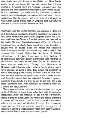 AUSTRALIA, LIKE THE UNITED STATES, experienced a different path to inclusive institutions than the one taken by England. The same revolutions that shook England during the Civil War and then the Glorious Revolution were not needed in the United States or Australia because of the very different circumstances in which those countries were founded— though this of course does not mean that inclusive institutions were established without any conflict, and, in the process, the United States had to throw off British colonialism. In England there was a long history of absolutist rule that was deeply entrenched and required a revolution to remove it. In the United States and Australia, there was no such thing. Though Lord Baltimore in Maryland and John Macarthur in New South Wales might have aspired to such a role, they could not establish a strong enough grip on society for their plans to bear fruit. The inclusive institutions established in the United States and Australia meant that the Industrial Revolution spread quickly to these lands and they began to get rich. The path these countries took was followed by colonies such as Canada and New Zealand.