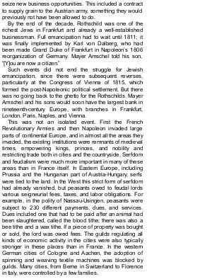 By the end of the decade, Rothschild was one of the richest Jews in Frankfurt and already a well-established businessman. Full emancipation had to wait until 1811; it was finally implemented by Karl von Dalberg, who had been made Grand Duke of Frankfurt in Napoleon’ s 1806 reorganization of Germany. Mayer Amschel told his son,“[ Y ] ou are now a citizen.”