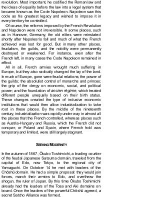 Of course, the reforms imposed by the French Revolution and Napoleon were not irreversible. In some places, such as in Hanover, Germany, the old elites were reinstated shortly after Napoleon’ s fall and much of what the French achieved was lost for good. But in many other places, feudalism, the guilds, and the nobility were permanently destroyed or weakened. For instance, even after the French left, in many cases the Code Napoleon remained in effect.