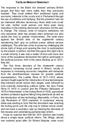 The response to the Black Act showed ordinary British people that they had more rights than they previously realized. They could defend their traditional rights and economic interests in the courts and in Parliament through the use of petitions and lobbying. But this pluralism had not yet delivered effective democracy. Most adult men could not vote; neither could women; and there were many inequities in the existing democratic structures. All this was to change. The virtuous circle of inclusive institutions not only preserves what has already been achieved but also opens the door to greater inclusiveness. The odds were against the British elite of the eighteenth century maintaining their grip on political power without serious challenges. This elite had come to power by challenging the divine right of kings and opening the door to participation by the people in politics, but then they gave this right only to a small minority. It was only a matter of time until more and more of the population demanded the right to participate in the political process. And in the years leading up to 1831, they did.