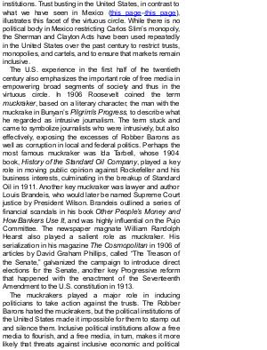 institutions. Trust busting in the United States, in contrast to what we have seen in Mexico( this page – this page), illustrates this facet of the virtuous circle. While there is no political body in Mexico restricting Carlos Slim’ s monopoly, the Sherman and Clayton Acts have been used repeatedly in the United States over the past century to restrict trusts, monopolies, and cartels, and to ensure that markets remain inclusive.