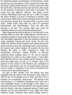 for marketing boards was that they, not the farmers, would absorb the price fluctuations. When world prices were high, the board would pay the farmers in Sierra Leone less than the world price, but when world prices were low, they would do the opposite. It seemed a good idea in principle. The reality was very different, however. The Sierra Leone Produce Marketing Board was set up in 1949. Of course the board needed a source of revenues to function. The natural way to attain these was by paying farmers just a little less than they should have received either in good or bad years. These funds could then be used for overhead expenditures and administration. Soon the little less became a lot less. The colonial state was using the marketing board as a way of heavily taxing farmers.