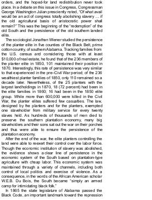 orders, and the hoped-for land redistribution never took place. In a debate on this issue in Congress, Congressman George Washington Julian presciently noted,“ Of what avail would be an act of congress totally abolishing slavery … if the old agricultural basis of aristocratic power shall remain?” This was the beginning of the“ redemption” of the old South and the persistence of the old southern landed elite.