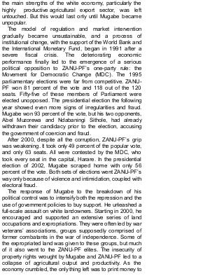 After 2000, despite all the corruption, ZANU-PF’ s grip was weakening. It took only 49 percent of the popular vote, and only 63 seats. All were contested by the MDC, who took every seat in the capital, Harare. In the presidential election of 2002, Mugabe scraped home with only 56 percent of the vote. Both sets of elections went ZANU-PF’ s way only because of violence and intimidation, coupled with electoral fraud.